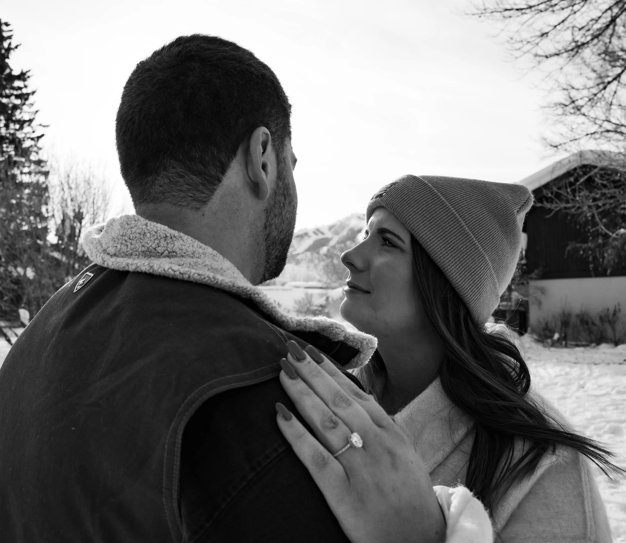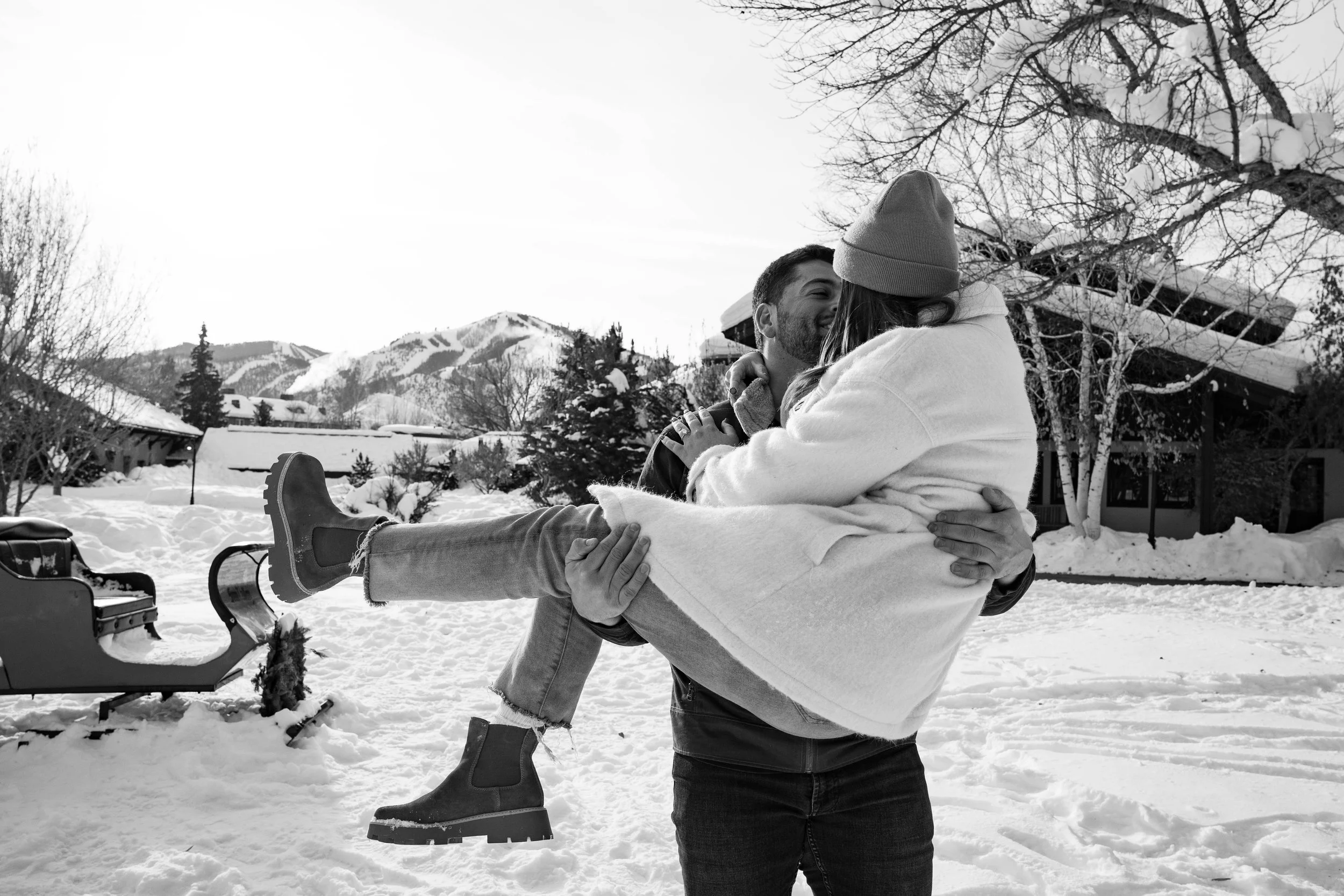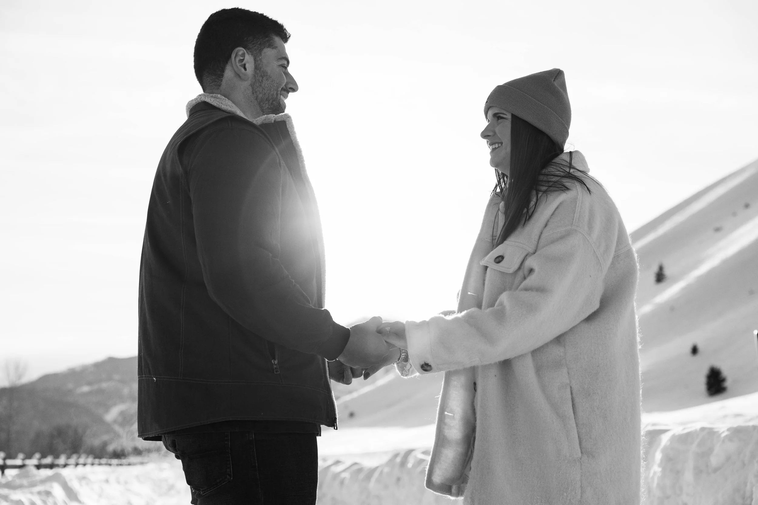Surrounded by the breathtaking beauty of their favorite place in the world, Hailey and Ryan's engagement photos are a love letter to Sun Valley. From the snow-capped mountains to historic Sun Valley Village, their session captures the essence of their enduring love against the stunning Idaho backdrop. Their laughter and affection shine through in every image, creating a timeless and romantic portrait of their journey together.